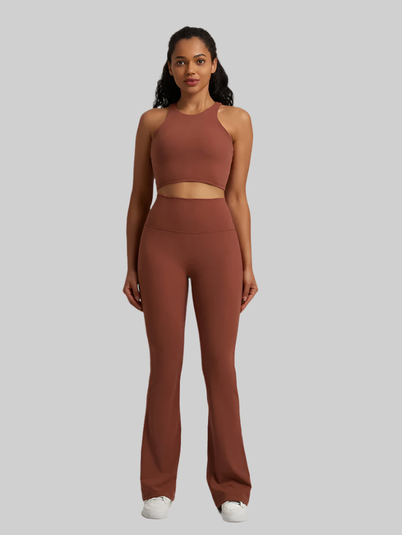 Upgrade your fitness wardrobe with the Naked Feel Yoga Set, a perfect combination of style, comfort, and performance. This two-piece outfit includes a padded racerback crop top and high-waisted flare leggings, designed to enhance your yoga, gym, or casual looks.